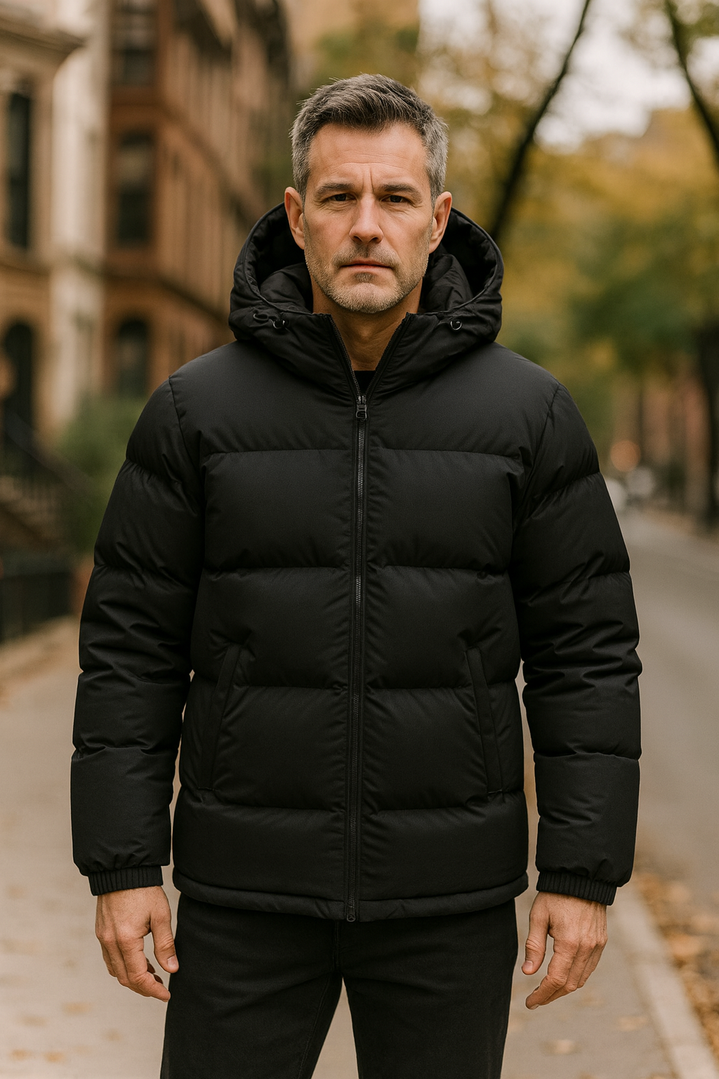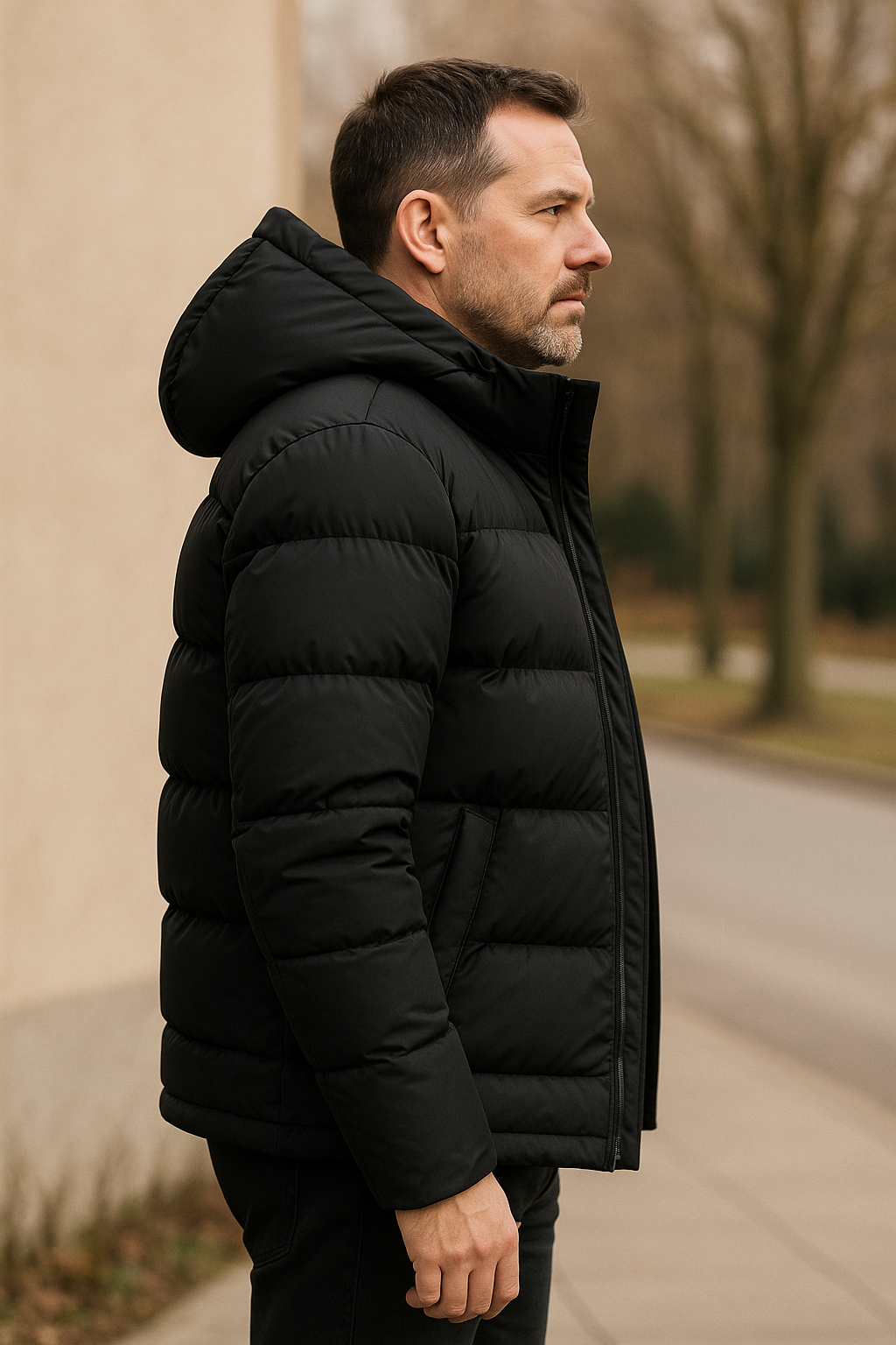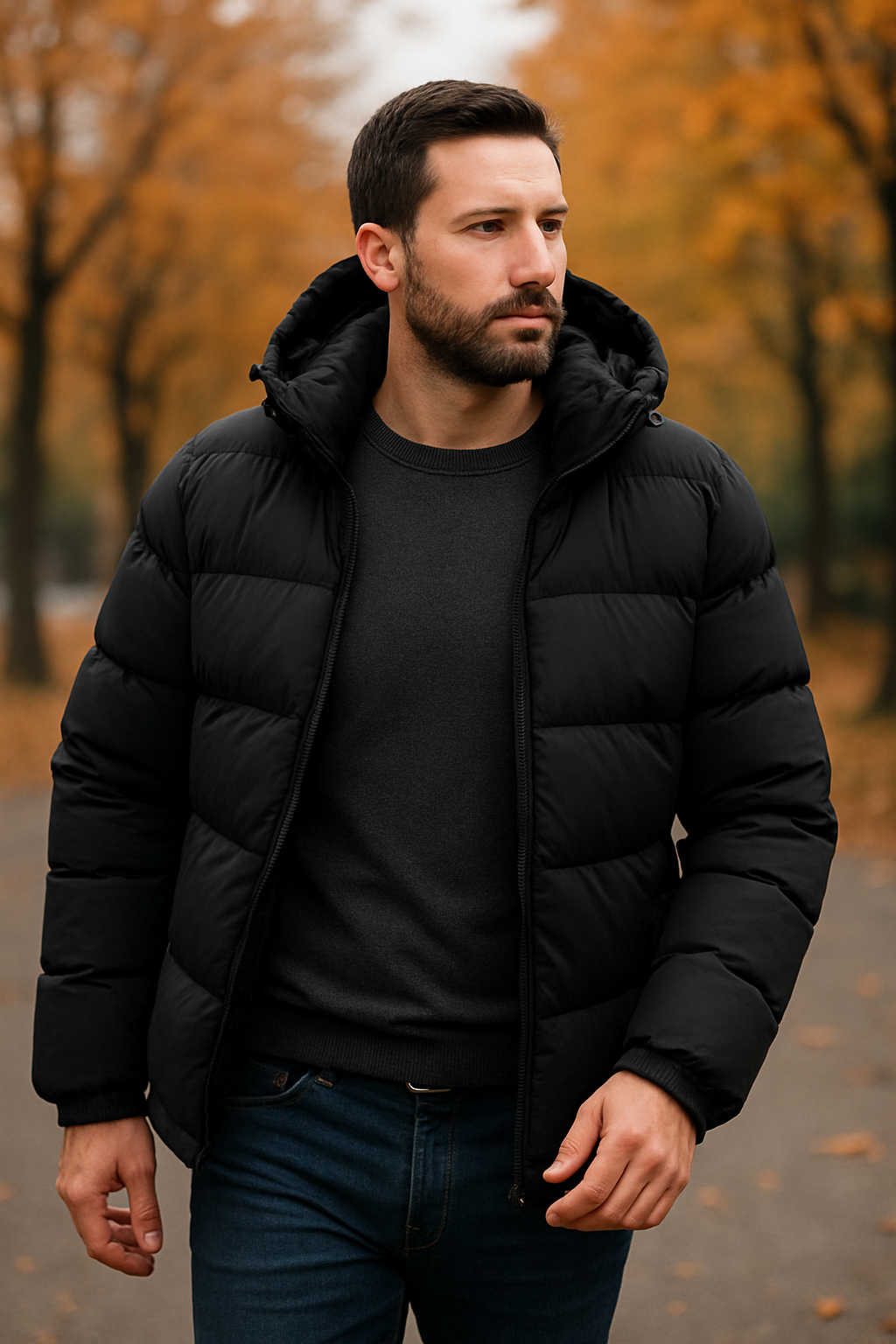Męska kurtka puchowa – płaszcz z kapturem i zamkiem błyskawicznym z przodu